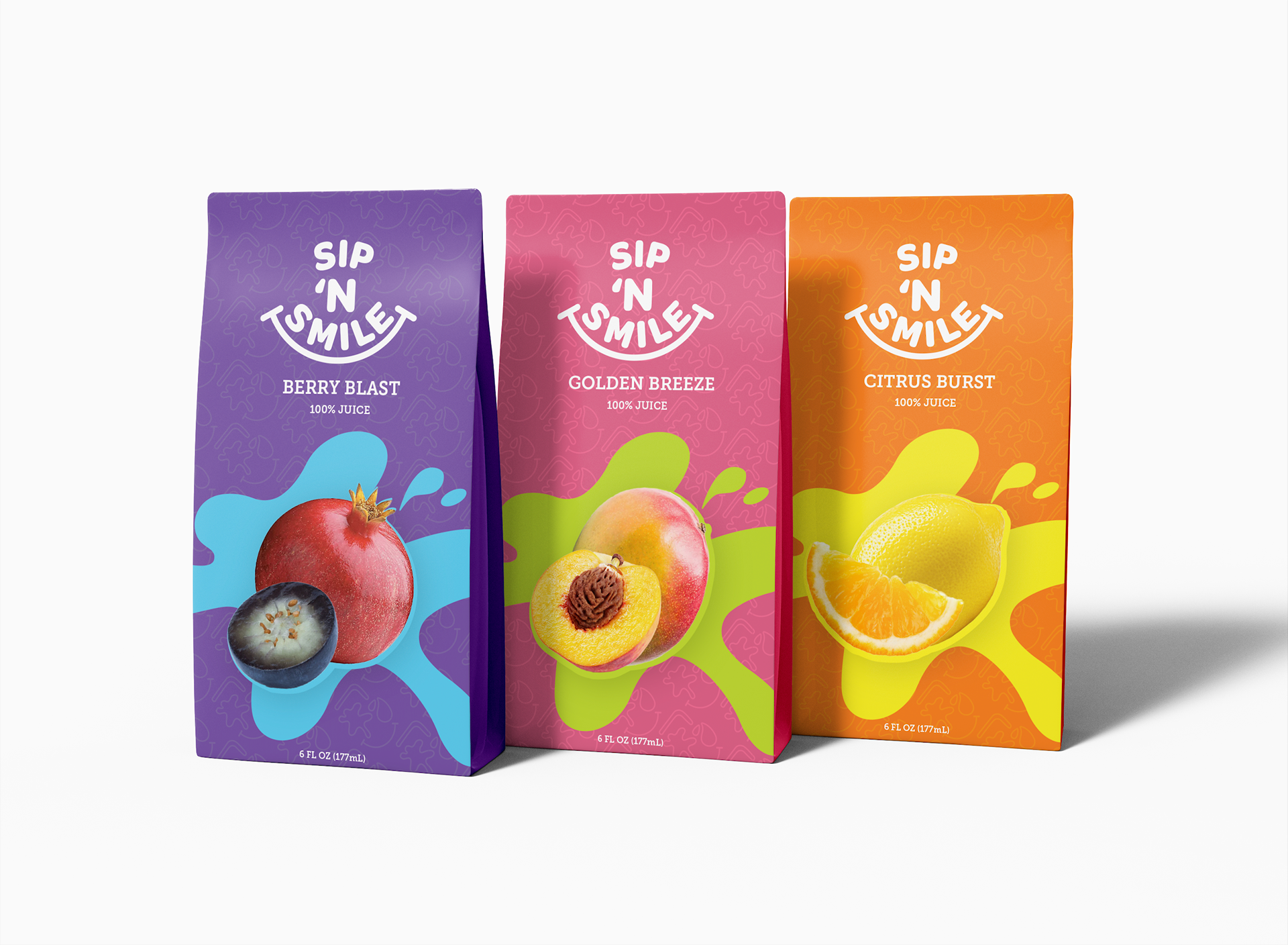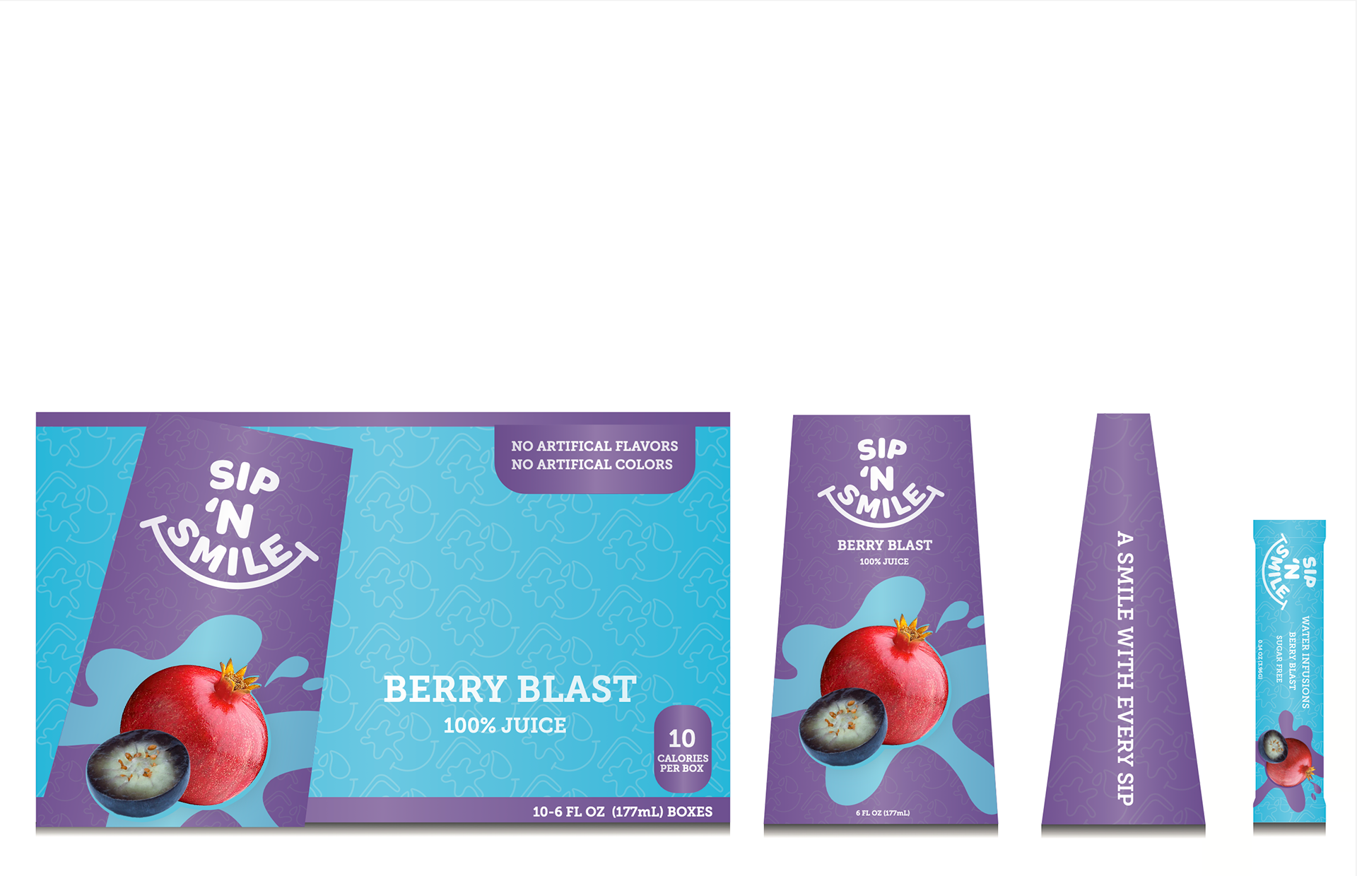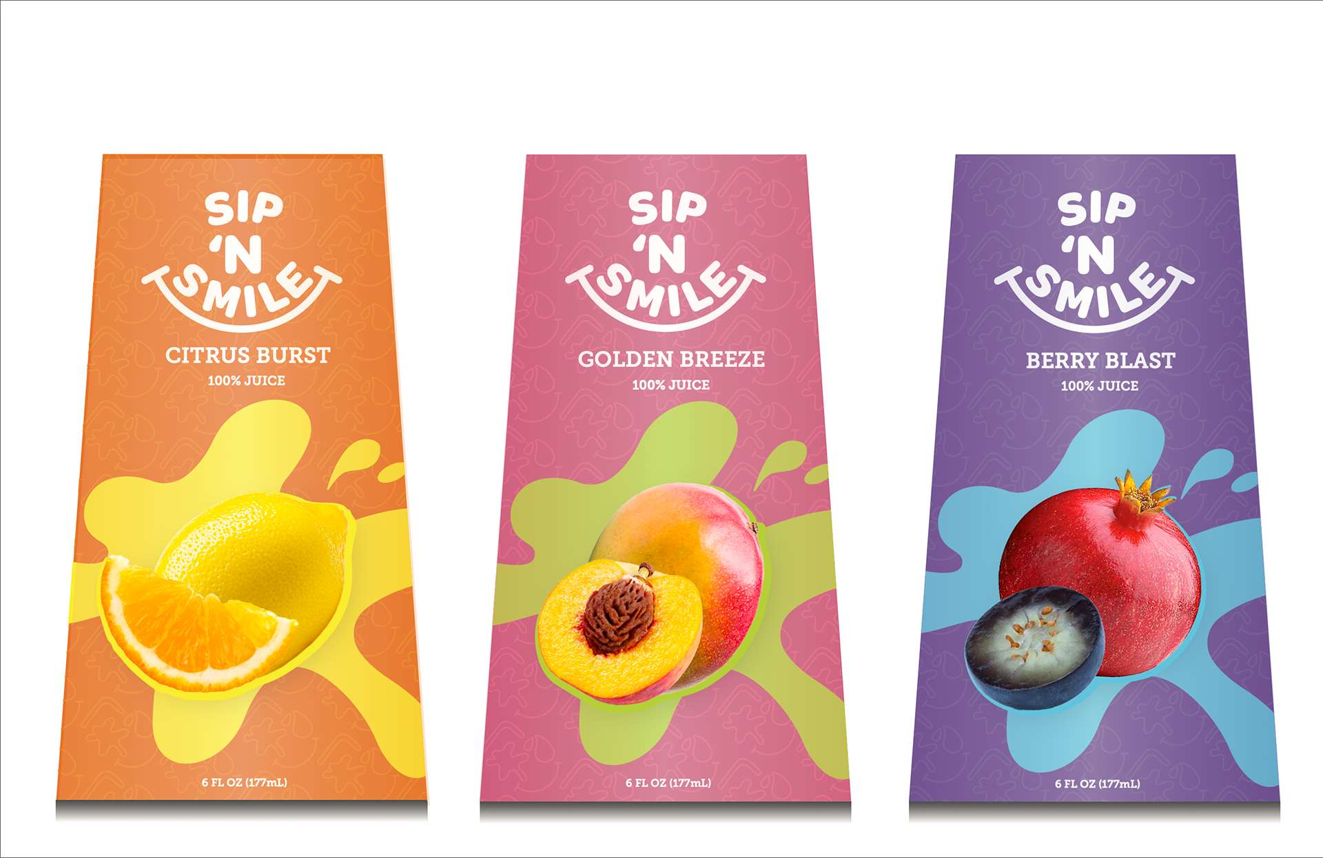 Sip and Smile is fun and energetic reflecting health and frivolity. With, fruit forward imagery, and splash illustrations, the product faces attract the attention of the young and the mature. Clear sans-serif typography conveys friendliness, while nutritional facts provide reassurance and build trust with adult buyers